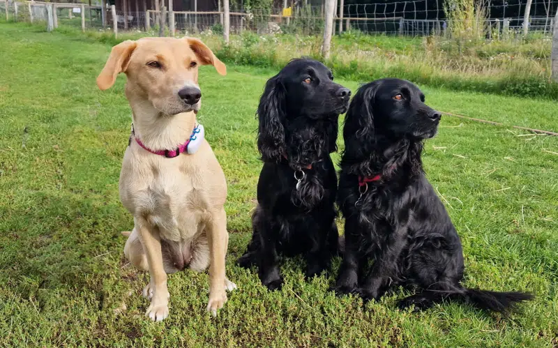 Eddie (til venstre) er en unghund og øver sig i at skulle med på jagt. Sako (til højre) er en dygtig jagthund og løber gerne om kap med eleverne for at vinde flødeboller. Derudover viser han glædeligt de besøgende, hvordan man opsporer vildt i det høje græs under jagtforløbene.
